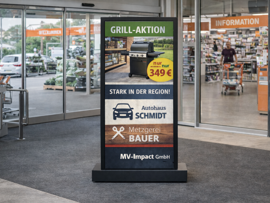 Unsere Werbestelen ermöglichen es Unternehmen, ihre Botschaften gezielt im eigenen Einzugsgebiet zu platzieren dort, wo potenzielle Kunden wohnen, einkaufen und Entscheidungen treffen.